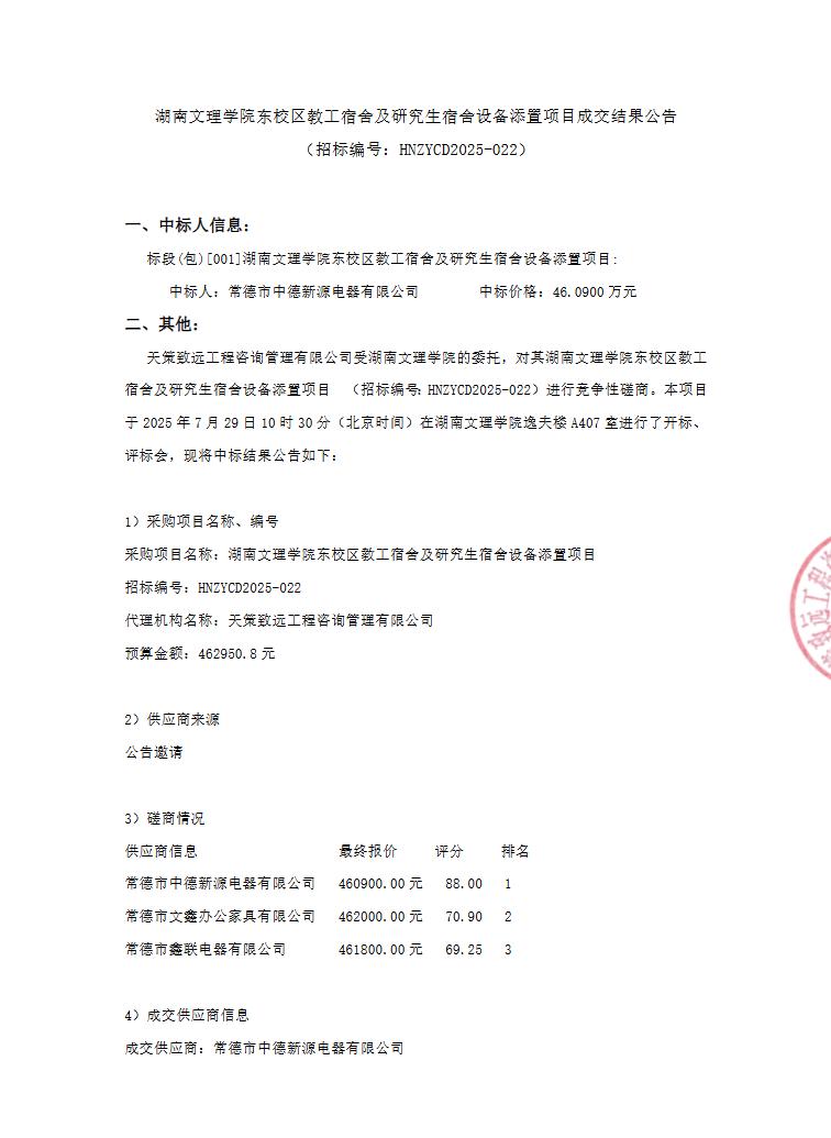 湖南文理学院东校区教工宿舍及研究生宿舍设备添置项目成交结果公告