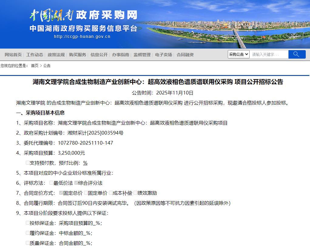 湖南文理学院合成生物制造产业创新中心:超高效液相色谱质谱联用仪采购项目公开招标公告